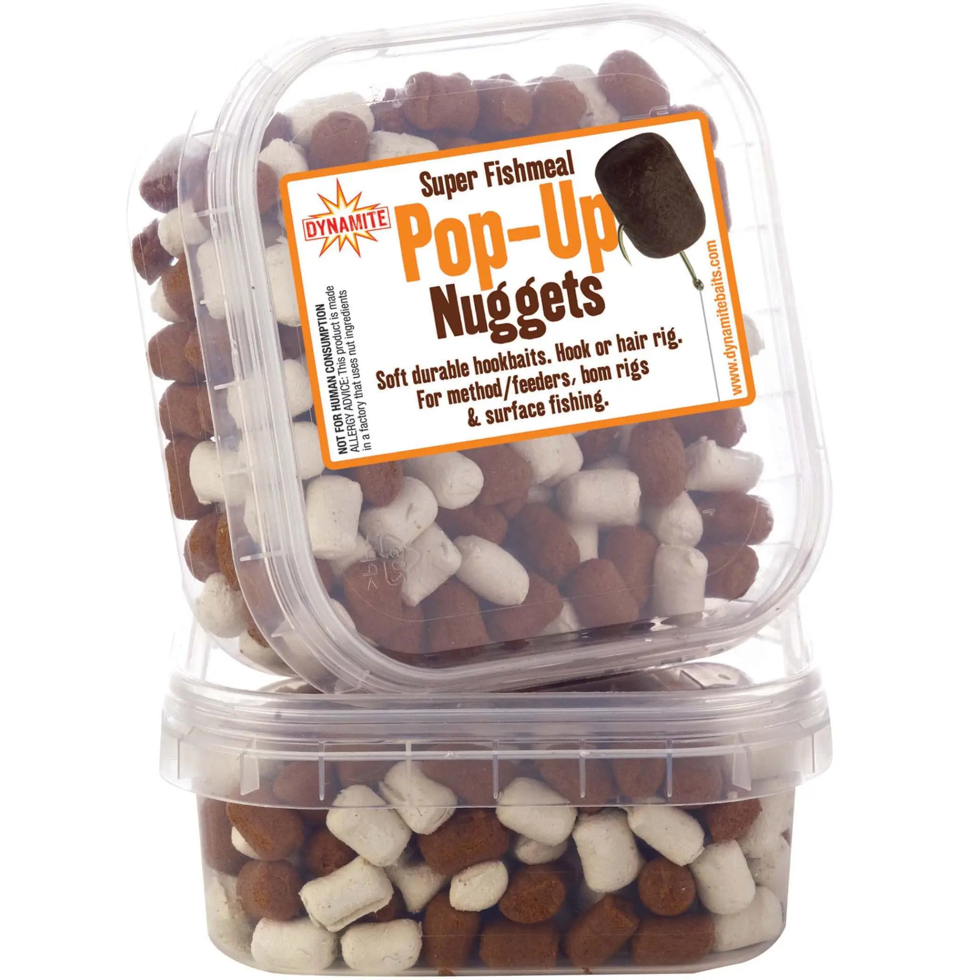 Extremely durable and visible hookbaits for commercial fishing. Made from fishmeal and enriched with amino acids. Bicolor and slowly sinking.