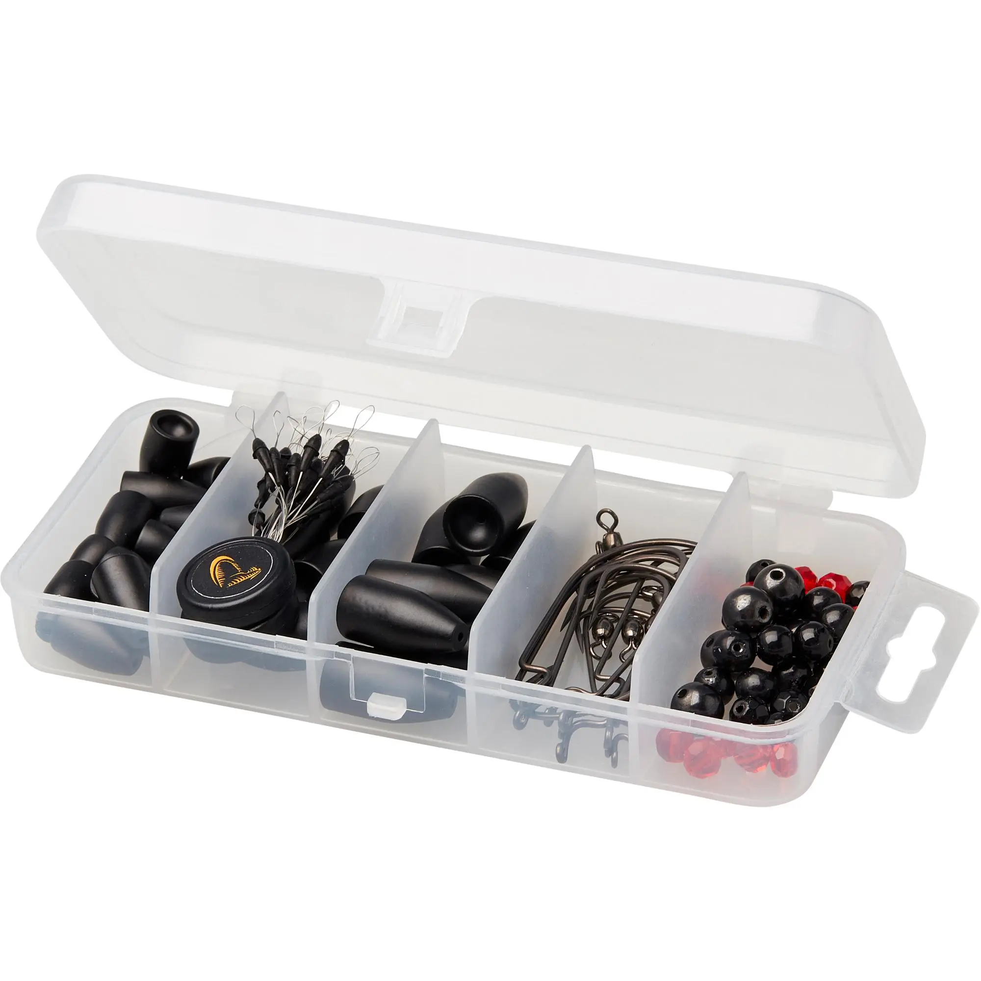 The ultimate kit for Texas and Carolina rigs, gummy worms, crayfish and creature baits. Contains stainless steel bullet weights and magnetic ironstone beads that offer many rigging options. The 100-piece box kit consists of:
